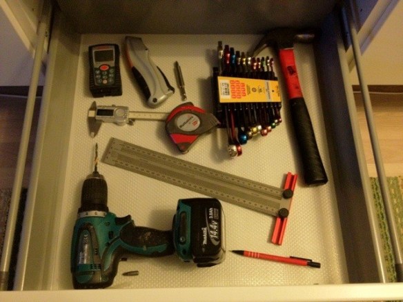Tydligen har min kära fru en annan åsikt om vad som ska finnas i dessa kökslådor. Enligt henne ska det vara ljus, servetter eller plastburkar. Med andra ord vad som helst som inte heter verktyg. Dessa ska tydligen förvaras i verktygslådan ute i garaget!