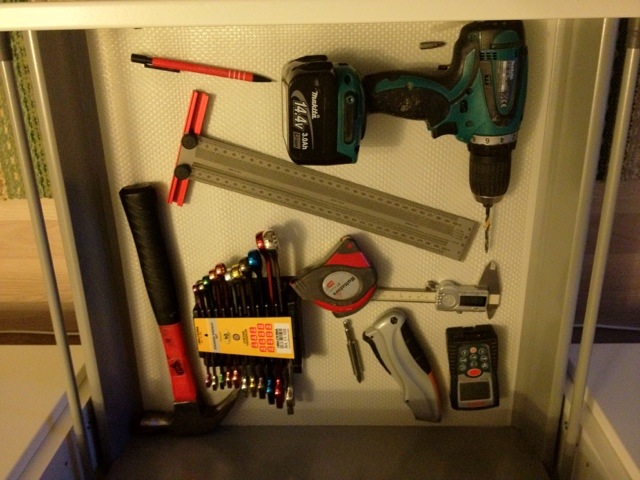 Nu när vi sätter in nya skåp i köket passade vi på att välja lådor istället för vanliga dörrar. Det var inte dumt alls att kunna lägga ner verktygen som används mest. Tänk vad praktisk att ha skruvdragare, måttband eller hammare i köket när något ska skruvas, mätas osv.