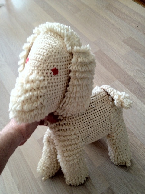 Jag har alltid tyckt om hundar! Jag tjatade väldigt mycket om att jag skulle ha en egen hund vilket min snälla mamma löste på detta sätt. Tror den är virkad (inga fräsar, sågar o.d var inblandade) jag tyckte väldigt mycket om den även om den mest satt i finsoffan.