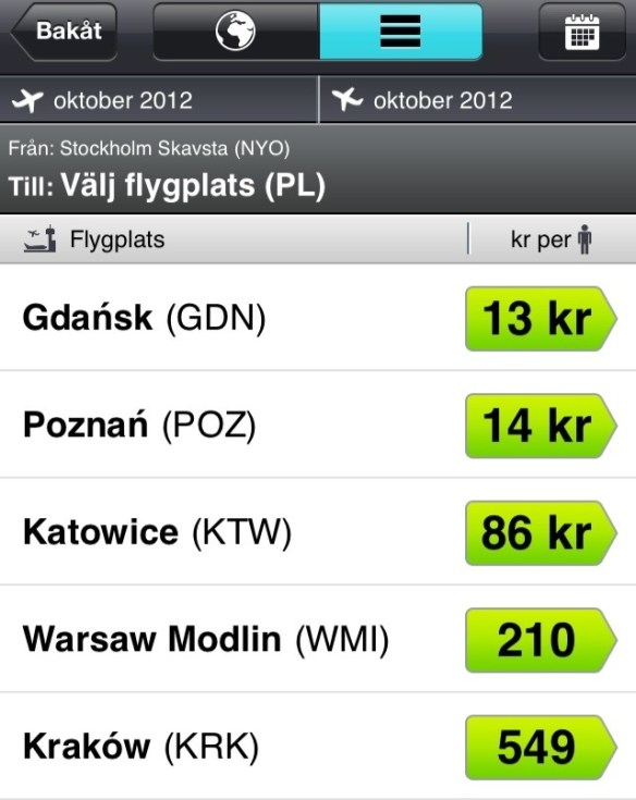 Ibland brukar jag låtsas resa till olika destinationer med hjälp av några appar i min mobil. Kollar hotell, flyg och saker jag vill se osv. Häromdagen valde jag att resa från Stockholm Skavsta någon gång i oktober, då fick jag dessa förslag. Gdansk kanske inte är mitt förstahandsval men för 13 kr kan jag tänka mig resa dit i alla fall.