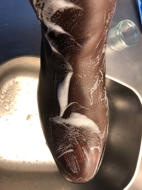 Med en klump i magen började jag leta efter något tvättmedel till skor. Kemiskt ren bensin skulle säkert göra dem rena på djupet, men inte det mest hälsosamma för lädret. Hittade ganska snabbt SAPHIR omninettoyant cleaner som verkade vara det jag behövde. Efter en rejäl tvätt så var skorna ordentligt rena. Smuts, salt och skokräm hade effektivt tvättats bort och plötsligt så syntes alla repor och märken som förut var dolda av skokräm.