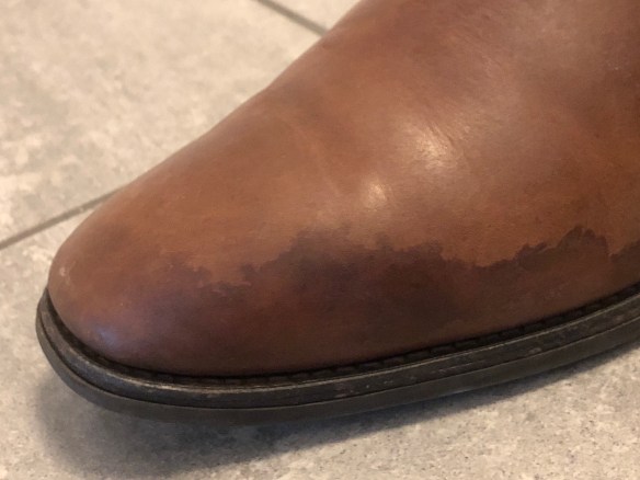 Med en klump i magen började jag leta efter något tvättmedel till skor. Kemiskt ren bensin skulle säkert göra dem rena på djupet, men inte det mest hälsosamma för lädret. Hittade ganska snabbt SAPHIR omninettoyant cleaner som verkade vara det jag behövde. Efter en rejäl tvätt så var skorna ordentligt rena. Smuts, salt och skokräm hade effektivt tvättats bort och plötsligt så syntes alla repor och märken som förut var dolda av skokräm.